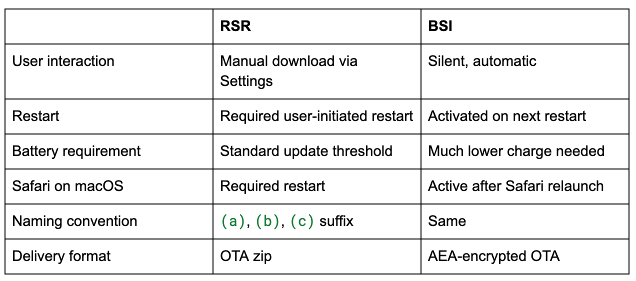 With iOS 26.1, iPadOS 26.1, and macOS 26.1, Apple replaced RSR with Background Security Improvements (BSI). The big change: BSI installs silently.